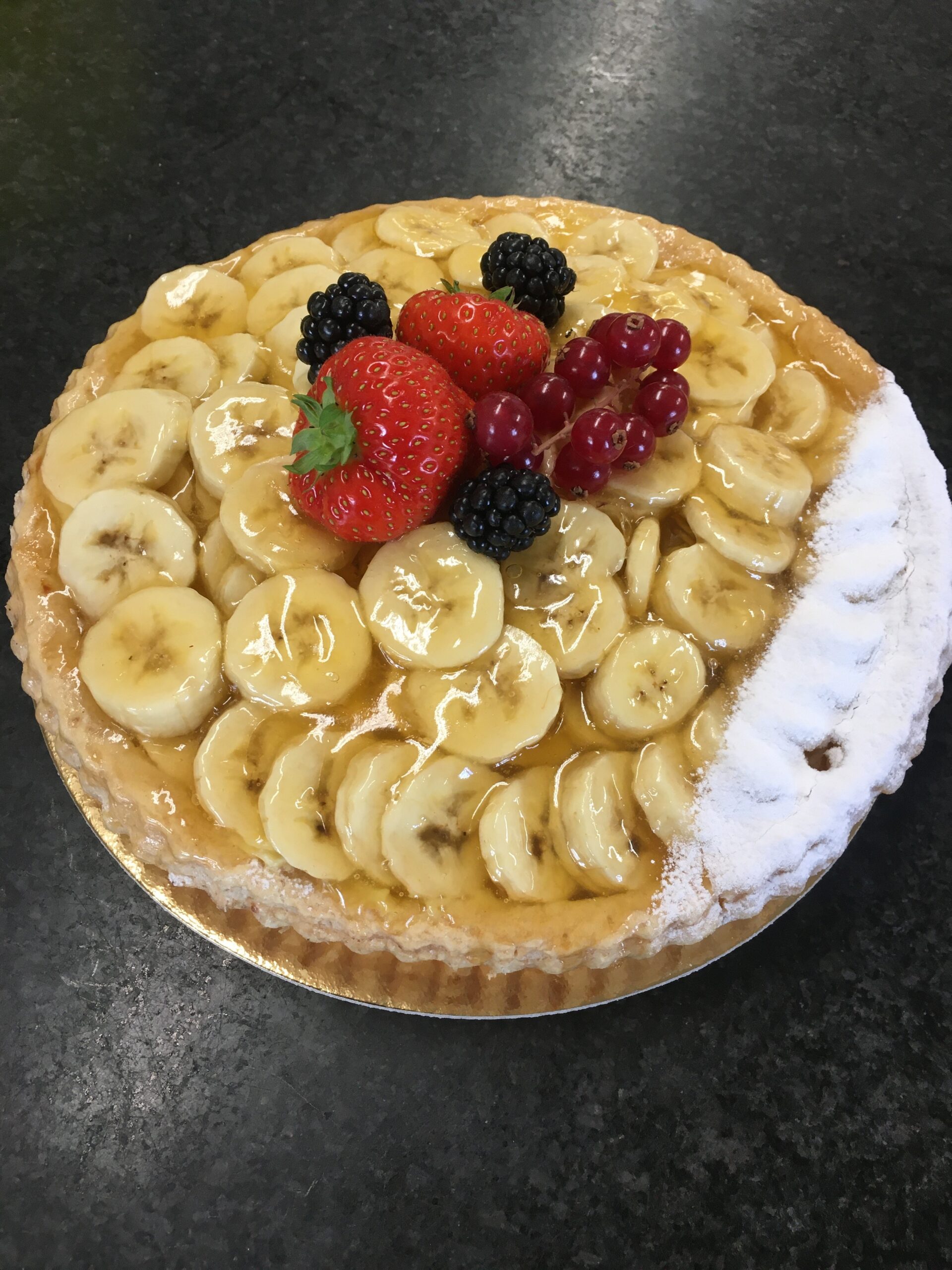melk, gist, eieren, tarwebloem (gluten), boter (melkvet), suiker, zout, bananen, puddingpoeder (maiszetmeel), slagroom, abrikozen gelei (soja)